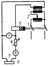 1 - выключатель; 2 - источник переменного тока на 100-600 В; 3 - защитное реле; 4 - переменный резистор; 5 - электроды; 6 - образец
