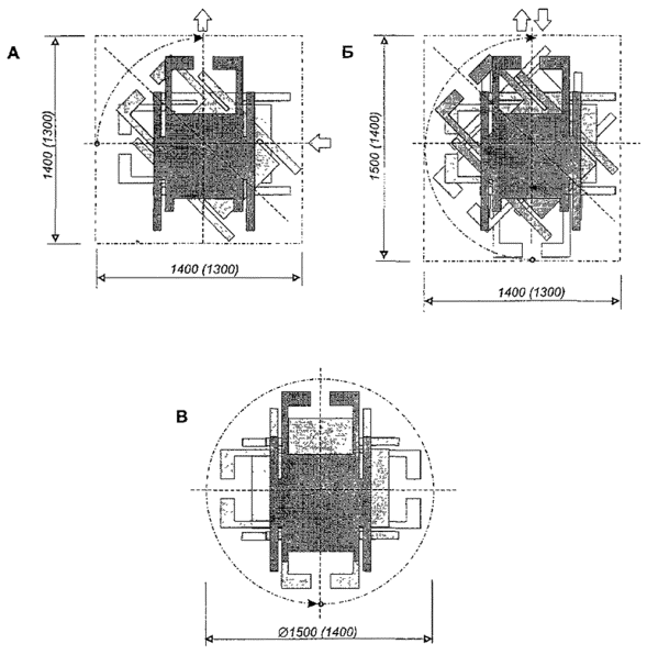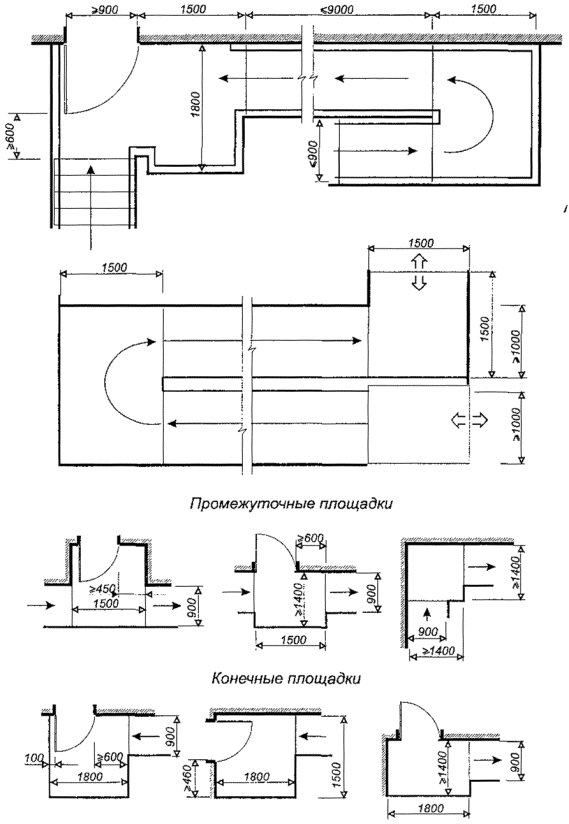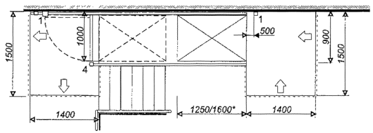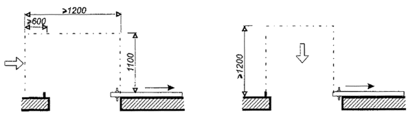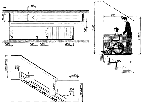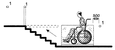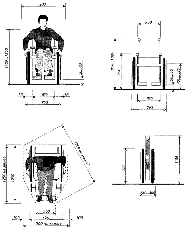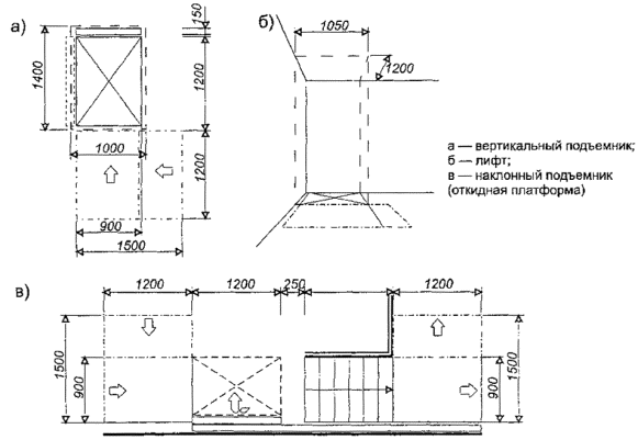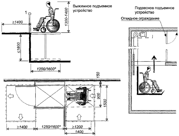 * Даны размеры площадки для подъема без сопровождающего лица - в числителе, в знаменателе - с сопровождающим лицом.