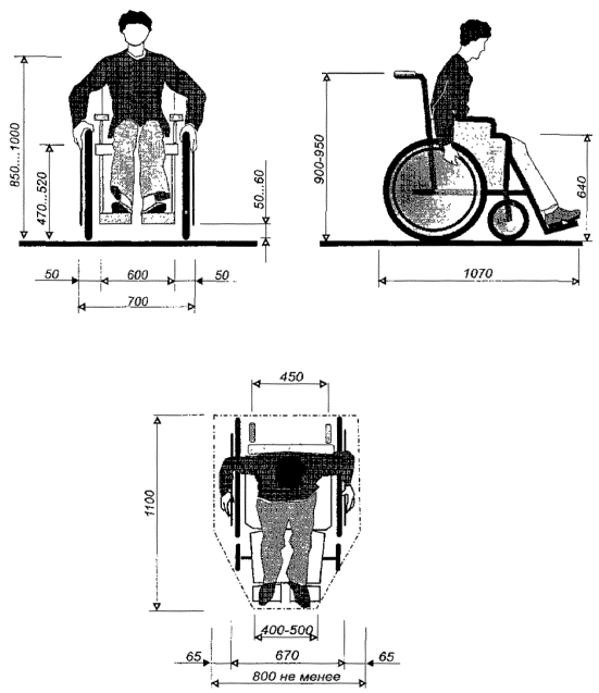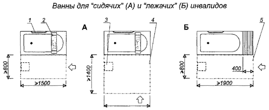 1 - поручень; 2 - съемное сиденье; 3 - сиденье откидное; 4 - зона маневрирования кресла-коляски; 5 - зона маневрирования каталки
