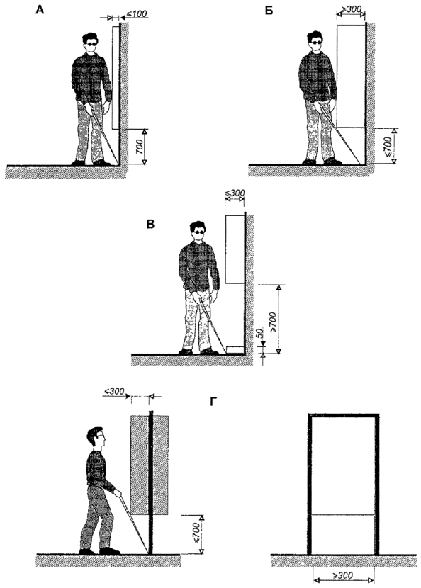 А - изменение фактуры и цвета полосы ориентации перед дверным проемом; Б - указание направления открывания дверей; В - выделение контрастной фактурной полосой дверного проема |