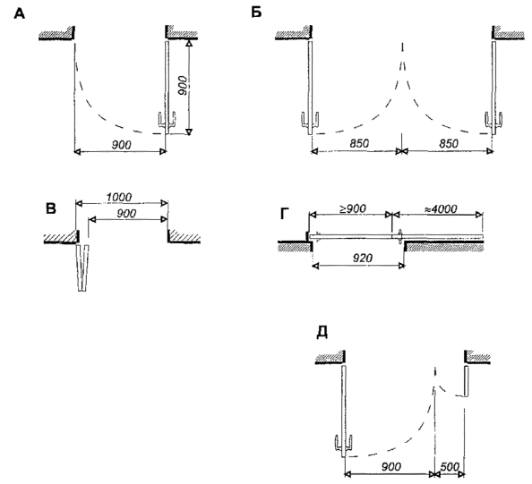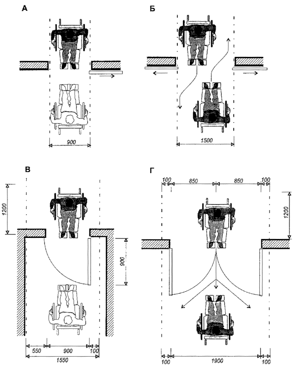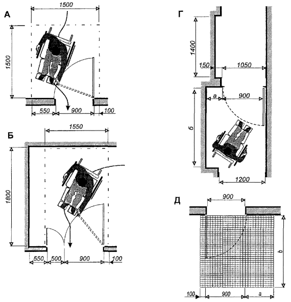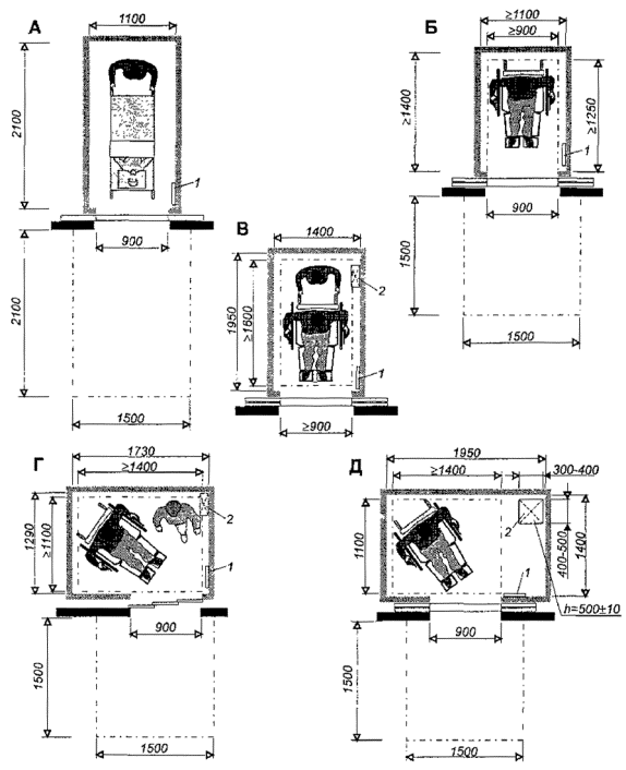 Минимальные внутренние размеры кабины лифта и площадки перед лифтом. Для транспортировки больного на каталке (А), для передвигающегося в кресле-коляске при различном расположении и открывании дверей (Б, Г, Д). Размеры кабины лифта - минимальные (Б, В), оптимальные (Г, Д). 1 - блок управления лифтом; 2 - откидное сиденье |