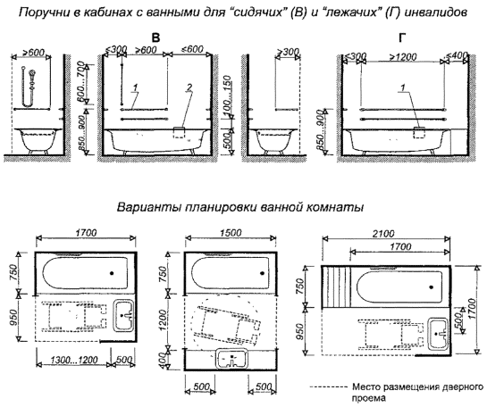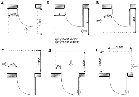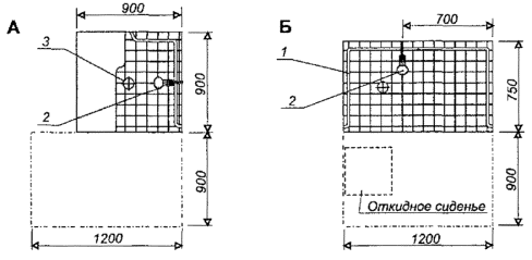 1 - поручень; 2 - душевая сетка; 3 - откидное или стационарное сиденье; 4 - занавес или раздвижная дверь; 5 - зона оптимальной доступности для размещения кранов; 6 - вертикальный поручень; 7 - горизонтальный поручень Функциональные зоны перед душевыми кабинами разных габаритов со стационарным оборудованием (А) и откидными сиденьями (Б)