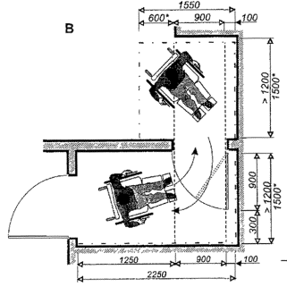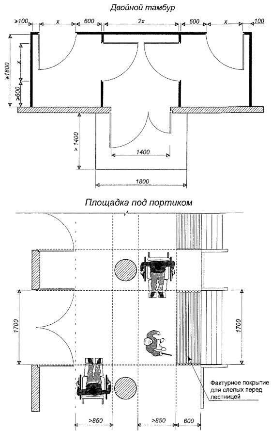 вариант «Б» - выделение в уровне входной площадки специальных помещений, зон или блоков, приспособленных и оборудованных для инвалидов. Следует предусматривать устройство специальных входов, специально обустроенных параллельных путей движения и мест обслуживания для лиц с нарушениями здоровья.
