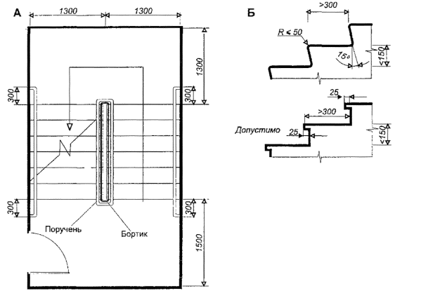 А - минимальные параметры лестничной клетки; Б - максимальные параметры ступени; В - принцип устройства поручня в общественных местах; Г - допустимые параметры внутренней лестницы в жилой ячейке; Д - правило определения соотношения ширины проступи и высоты подступенка