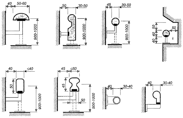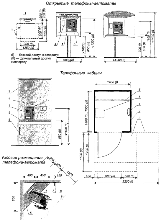 1 - телефонный аппарат; 2 - телефонная будка; 3 - зоны для подъезда кресла-коляски; 4 - список телефонов экстренного вызова и другая информация; 5 - полка или место для размещения телефонного справочника; 6 - откидное сиденье; 7 - крючок для костыля или трости; 8 - рельефная полоса или смена цвета в покрытии пола |