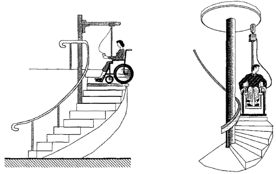 А. Лестничное подъемное устройство: - размеры платформы, мм: 680´750, 800´1000, 900´1200 - угол подъема - 0-90° - грузоподъемность, кг: 150, 200, 250-300 - габариты в сложенном виде, мм: ширина - 300, длина 500-1800, высота - 900. Б. Подвесное подъемное устройство: - габаритные размеры грузонесущей части, мм - 400´200´300 - угол подъема (max) - 90° - радиус поворота направляющей (min), м - 0,3 - грузоподъемность, кг- 150, 200, 250, 300 |