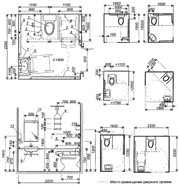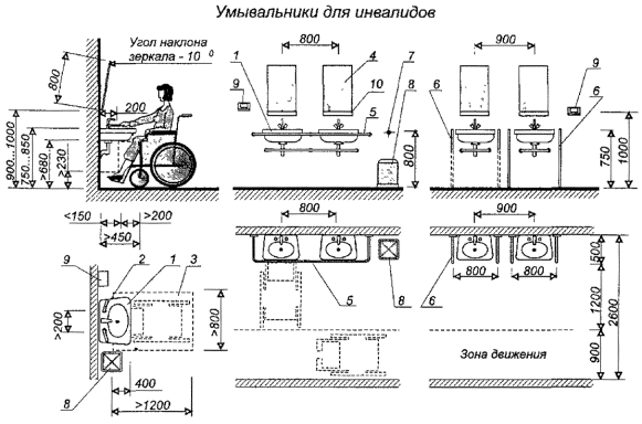 1 - раковина умывальника; 2 - рычаги управления кранами (вариант); 3 - зона кресла-коляски; 4 - зеркало (при наклоне середина зеркала - на высоте 1250 мм); 5 - горизонтальная опора; 6 - откидывающаяся опора-кронштейн; 7 - кнопка управления крышкой бачка; 8 - мусорный бачок; 9 - полотенце (фен); 10 - полка