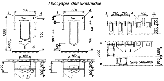 1 - поручни опоры; 2 - смывной кран (ручной); 3 - смывной кран (ножной); 4 - кнопка управления смывом; 5 - опора вертикальная |