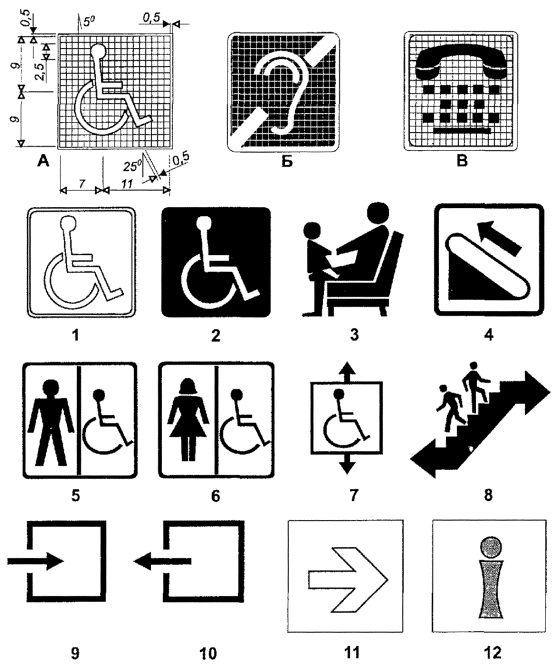 А - пропорции символа доступности для инвалидов; Б - пропорции символа доступности для людей с нарушением слуха; В - пропорции символа «Телекоммуникационные устройства для людей с нарушением слуха»; 1,2 - символы доступности для инвалидов; 3 - место для инвалидов, пожилых с детьми; 4 - эскалатор (подъемник); 5, 6 - туалеты для инвалидов; 7 - лифт для инвалидов; 8 - пути эвакуации; 9, 10 - вход и выход из помещения; 11 - направление движения (поворот); 12 - информационный центр (справочная) |