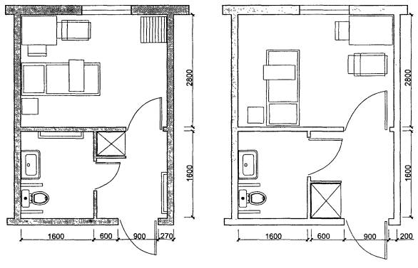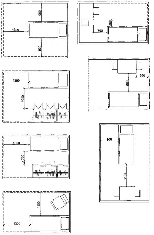 5.11 В ряде случаев бывает необходимо обеспечить двусторонний доступ кровати или исключительно лево-, правосторонний доступ, что следует учитывать при проектировании. В двухместных спальных помещениях кровати, как правило, должны располагаться раздельно. Помимо прочих удобств такая расстановка обеспечивает рациональное использование площади помещения.