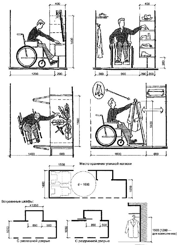 5.13 Жилые комнаты (для супружеских пар, неполных семей с инвалидами и пр.) следует оборудовать индивидуальными шкафами для белья, одежды, обуви и других личных вещей. Индивидуальные шкафы для верхней одежды инвалидов следует предусматривать в передних квартир; такие шкафы должны быть либо встроенными, либо подвесными с тем, чтобы обеспечить подъезд к ним вплотную кресла-коляски.