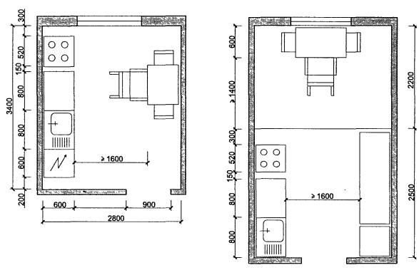 5.25 Площадь кухни для квартир с проживанием пожилых пар и малых семей с инвалидами должна быть не менее 9 м2 или, при наличии инвалида, передвигающегося на кресле-коляске, а также для сложных или многодетных семей и семейных детских домов, 12 м2. Возможно сокращение площади рабочей кухни ниже приведенных значений при наличии приближенной обеденной зоны в столовой или гостиной. Для однокомнатных квартир при площади жилой комнаты не менее 16 м2 допускается устройство кухни-ниши (с естественным освещением согласно СНиП 23-05) площадью 4,5-5,5 м2 с фронтом оборудования суммарной протяженностью не менее 2,4 м. Кухня должна иметь ширину не менее: в однокомнатной квартире - 2,2 м; в других - 2,8м.