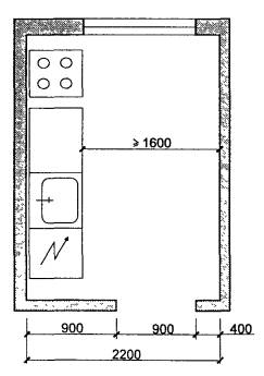 5.24 Кухни (рисунки 5.5 и 5.6), оборудование которых адаптируется для нужд инвалидов или пожилых, должны, как правило, обеспечивать им возможность самостоятельного ведения домашнего хозяйства, что, помимо комфорта, повышает уровень реабилитации. Планировочные решения кухонь должны позволять осуществлять большинство манипуляций с одной остановки кресла-коляски. При этом зона для кресла-коляски должна обеспечивать возможность его кругового разворота. Диапазон высот установки оборудования при этом должен находиться в пределах 0,4-1,4 м.