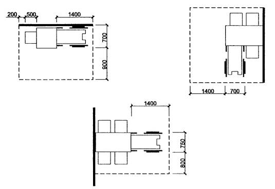 5.23 В составе квартиры, проектируемой для нужд инвалидов, рекомендуется предусматривать помещение для хозяйственных работ и занятий индивидуальной трудовой деятельностью (рисунок 5.11). Ширина такого помещения должна быть не менее 2,5 м; площадь - 8 м2. При отсутствии указанного помещения рабочее место (с приближенным шкафом глубиной 0,45-0,6 м) может предусматриваться в пределах кухни или общей комнаты, а кладовая для хранения материалов и изделий (не менее 4 м2) - как в квартире, так и за ее пределами. Дополнительное рабочее место может быть организовано вблизи остекленной части летнего помещения.