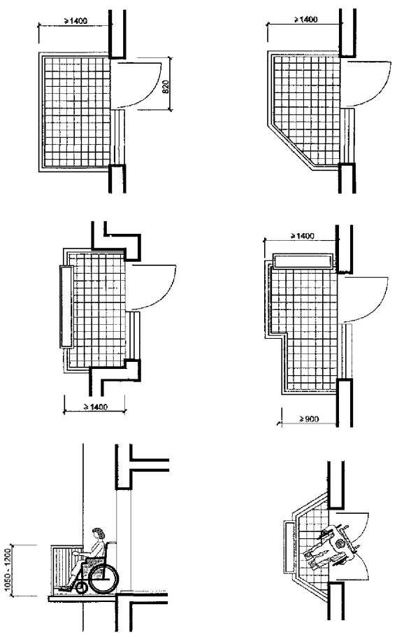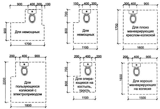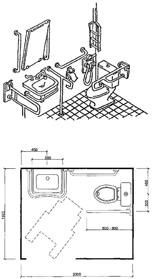 5.29 Различия в возможности пользования санитарными узлами позволяют выделить следующие группы инвалидов: а) требующие помощи как при передвижении, так и в раздевании и в гигиеническом цикле; б) требующие некоторой помощи в гигиеническом цикле; в) практически не нуждающиеся в посторонней помощи; г) люди, пользующиеся костылями, тростью, т.е. движение которых затруднено. Группе «а» требуется помощь совместно проживающих или персонала, подъемник, зона пересадки; группе «б» - требуется дополнительная площадь для самостоятельного маневра на кресле-коляске, место пересадки, поручни и штанги; примерно то же требуется и инвалидам группы «в», но меньшей площади. Передвигающимся на костылях или с помощью трости требуется наличие элементов поддержки (поручни, штанги), при этом площадь санитарного узла должна быть несколько более обычных стандартов (в пределах 20 %).