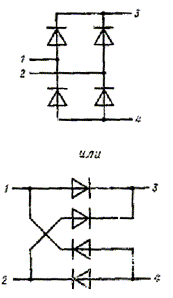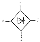 б) упрощенное изображение (условное графическое обозначение) Примечание. К выводам 1-2 подключается напряжение переменного тока; выводы 3-4 - выпрямленное напряжение; вывод 3 имеет положительную полярность. Цифры 1, 2, 3 и 4 указаны для пояснения. |