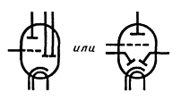 и) комбинированной электронной лампы при раздельном изображении систем электродов с внутренним разделительным экраном (вывод экрана показывают на одной половине изображения) |