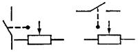 Примечания: 1. Точка указывает положение подвижного контакта резистора, в котором происходят срабатывание замыкающего контакта. При этом замыкание происходит при движении от точки, а размыкание - при движении к точке. 2. При разнесенном способе замыкающий контакт следует изображать 3. Точку в обозначениях допускается не зачернять |