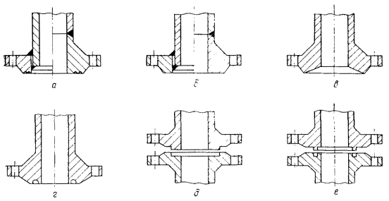 а - гладкая с уплотнительными канавками; б – гладкая; в - под линзовую прокладку; г - под кольцевую прокладку овального сечения; д - выступ-впадина; е - шип-паз.