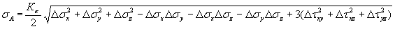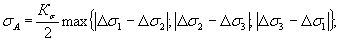 5.3. Для каждого вида нагрузки рассчитывают размах отдельных составляющих напряжений Δσх, Δσy, Δσz, Δτхy, Δτхz, Δτyz, Δσ1, Δσ2, Δσ3 как разность напряжений обоих нагруженных состояний, входящих в цикл.