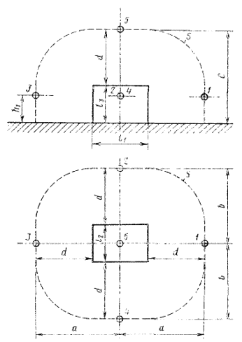В качестве измерительной поверхности следует принимать полусферу или измерительную поверхность, которая расположена на одном и том же измерительном расстоянии d от огибающего испытываемый источник шума параллелепипеда (см. черт. 1). Параллелепипед, огибающий источник шума, - условная поверхность, так же окружающая источник шума и заканчивающаяся на звукоотражающей плоскости. Размеры параллелепипеда должны соответствовать габаритным размерам источника шума. При определении их не следует учитывать части источника, которые существенно не излучают звуковой энергии (рычаги, концы валов и т.п.), но следует учитывать траектории, описываемые движущимися при работе частями источника шума.