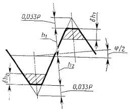 5. Отклонение расстояний вершин и впадин резьбы трубки и муфты от линии среднего диаметра резьбы (dh1 и dh2 по черт. 4) не должны превышать: