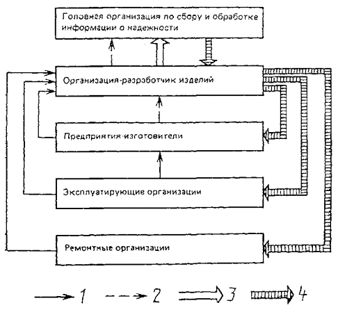 1 - первичная информация о надежности изделий в эксплуатации; 2 - обработанная информация для разработки мероприятий по повышению надежности; 3 - итоговая информация; 4 - мероприятия по повышению надежности изделий