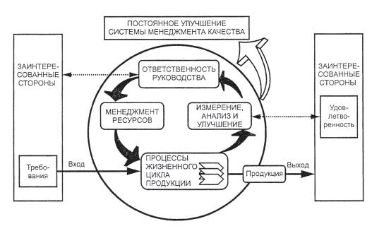 Приведенная на рисунке 1 модель системы менеджмента качества, основанная на процессном подходе, иллюстрирует связи между процессами, представленными в разделах 4-8. Эта модель показывает, что заинтересованные стороны играют существенную роль при определении входных данных. Мониторинг удовлетворенности заинтересованных сторон требует оценки информации о восприятии заинтересованными сторонами выполнения их требований. Приведенная на рисунке 1 модель не детализирует процессы.
