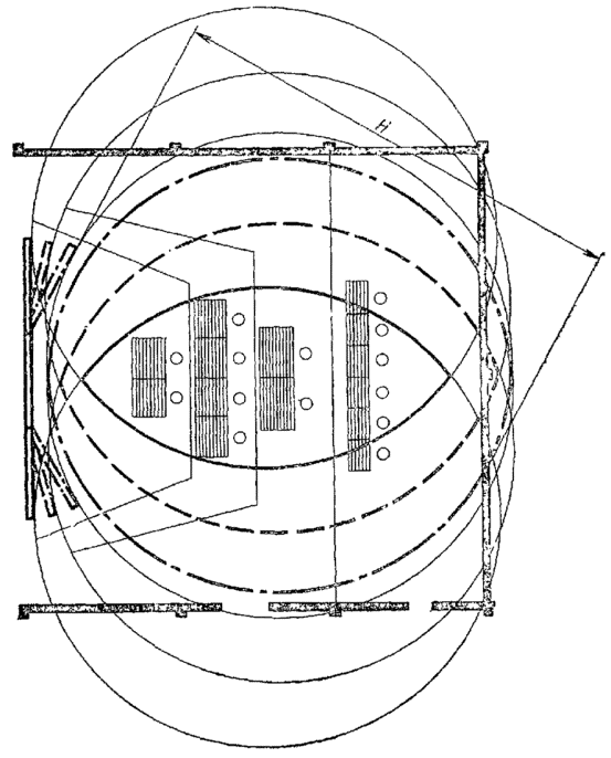 2.5. Построение в плане зоны наилучшего видения для залов и кабин с коллективными средствами отображения информации, представляющими плоский экран и экраны с повернутыми боковыми секциями, приведено на черт. 2.