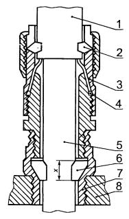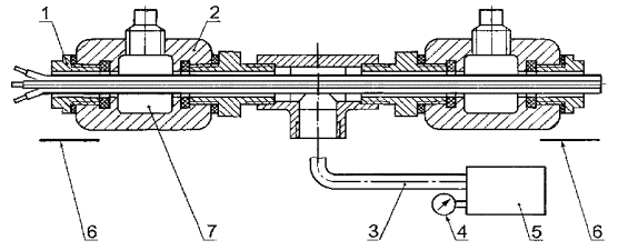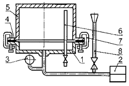 1 - стенд для гидравлических испытаний; 2 - устройство для создания давления воды (насос); 3- прибор для измерения давления; 4 - резиновая прокладка; 5 - испытуемая деталь; 6 - трубка для выхода воздуха при заполнении водой; 7 - струбцина для крепления испытуемой детали к стенду; 8 - трубка для предварительного заполнения оболочки водой