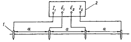 3.7. Измерение УЭС должно производиться в период отсутствия промерзания грунтов на глубине заложения трубопроводов тепловых сетей по четырехэлектродной схеме (рис. 1), с помощью измерителей сопротивления заземления М-416, Ф-416, МС-08 или других приборов. В качестве электродов применяются стальные стержни длиной 250-350 и диаметром 15-20 мм (технические и метрологические характеристики приборов даны в приложении 1).