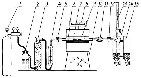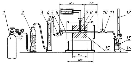 Чтобы удалить примесь серы из огнеупорной трубки, ее перед работой прокаливают при рабочей температуре по всей длине в трубчатой печи 7, обеспечивающей температурный нагрев до 1400 °С; термопары с регулятором 8 для регулирования температуры печи; фарфоровой неглазурованной лодочки 9 по ГОСТ 9147, предназначенной для сжигания навески и выдерживающей температуру до 1400 °С. Перед работой лодочку прокаливают при рабочей температуре в токе кислорода и хранят в эксикаторе по ГОСТ 25336. Шлиф крышки эксикатора не должен покрываться смазывающими веществами; трансформатора 10 для регулирования рабочего напряжения печи; стеклянной трубки 11 с расширением или хлоркальциевой трубки, заполненной стеклянной или обычной ватой, для очистки смеси газов, выходящих из печи, от механических примесей, образующихся при сжигании навески и уносимых из печи током кислорода; крана 12; микробюретки 13 или бюретки вместимостью 25 см3, содержащей титрованный раствор йодид-йодата калия; поглотительного сосуда 14; контрольного сосуда сравнения 15.