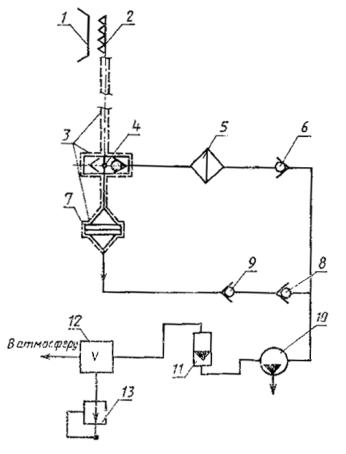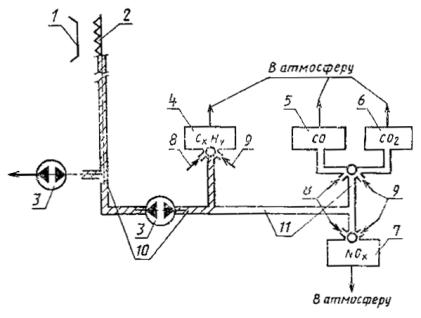 1 - сопло двигателя; 2 - пробоотборник; 3 - устройство обогрева трубки от 60 до 175 °С; 4 - переключающий клапан; 5 - фильтр грубой очистки; 6, 8 - дроссельные клапаны; 7 - фильтродержатель; 9 - отсечной клапан; 10 - вакуумный насос; 11 - ротаметр; 12 - камерный счетчик газа; 13 - измеритель давления и температуры