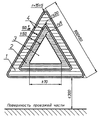 6.1 Полый в центре предупреждающий треугольник имеет красную кайму, состоящую из наружной светоотражающей полосы и внутренней флуоресцирующей полосы, причем все приспособление должно находиться на определенной высоте над поверхностью проезжей части. Полый центр, флуоресцирующие и светоотражающие полосы ограничиваются контурами в форме концентрических равносторонних треугольников.