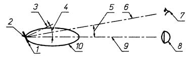 1 - светоотражатель; 2 - исходный центр; 3 - исходная ось, перпендикулярная к отражающей поверхности; 4 - угол освещения (входа) b; 5 - угол наблюдения (угол отклонения, указанный в таблице 2 настоящего стандарта) a; 6 - ось наблюдения; 7 - фотометрическая головка; уровень глаз водителя; 8 - источник света - фара транспортного средства; 9 - ось освещения; 10 - распределение отраженного света