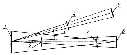 1 - светоотражатель; 2 - угловая апертура источника света d £ 10¢; 3 - угол наблюдения (угол отклонения, указанный в таблице 2 настоящего стандарта) a; 4 - угловая апертура фотоприемника g £ 10¢; 5 - фотометрическая головка; 6 - источник света; 7 - угловая апертура светоотражателя h £ 80¢