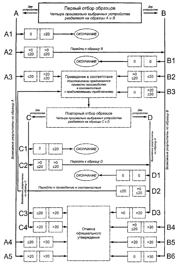 Если в ходе определенного типа испытания выявляется несоответствие каких-либо отобранных образцов, то отбираются и испытываются новые образцы. Предприятие-изготовитель принимает меры для обеспечения соответствия данного производства.