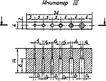 2.12. Форма имитаторов может быть произвольной, глубину и ширину (диаметр) канавок и отверстий следует выбирать по табл.2 (количество канавок и отверстий не ограничивается). Имитаторы должны иметь паспорта или сертификаты (на партию) со штампом предприятия-изготовителя, в которых обязательно указывается материал, из которого они изготовлены, их толщина, глубина всех канавок (отверстий) и их ширина (диаметр отверстий). С целью более точного распознавания дефектов (типа шлаковых включений) допускается заполнение отверстий имитаторов жидким стеклом.
