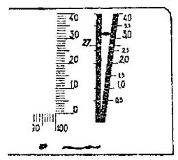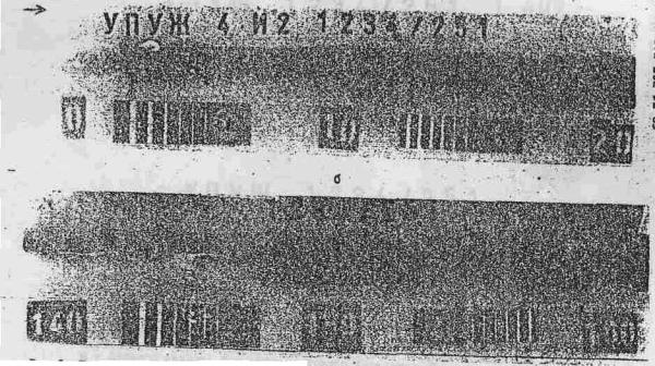 Диаметр и длину отдельного дефекта определяют с помощью измерителя, помещенного в правой части дефектоскопической линейки. При этом линейку накладывают на снимок таким образом, чтобы дефект оказался в клинообразном окне измерителя, а края дефекта касались границ окна, как показано на рис. 2 и 3. Против точек касания считывают (приближенно определяют) размер дефекта. Так, на рис. 2 диаметр дефекта равен 2,0 мм, на рис. 3 длина дефекта равна 3,2 мм. Ошибка в определении размера отдельного дефекта с помощью данного измерителя не превышает 0,1-0,2 мм.
