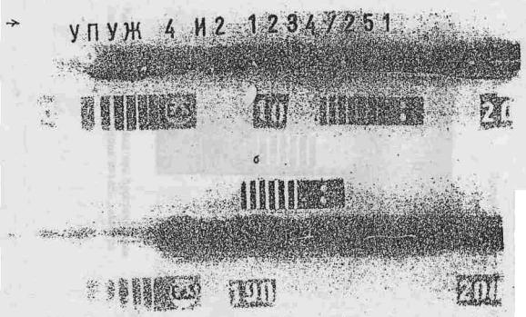 1. На снимке видны изображения двух продольных трещин, длина которых 10 мм, а глубина 20% толщины основного металла; непровара по кромке длиной 100 мм и глубиной 7%; одного шлакового включения с максимальным размером 5 мм и глубиной 10%; цепочки пор длиной 25 мм с диаметром поры 2 мм и глубиной 5%. При расшифровке этого снимка производят следующую запись: