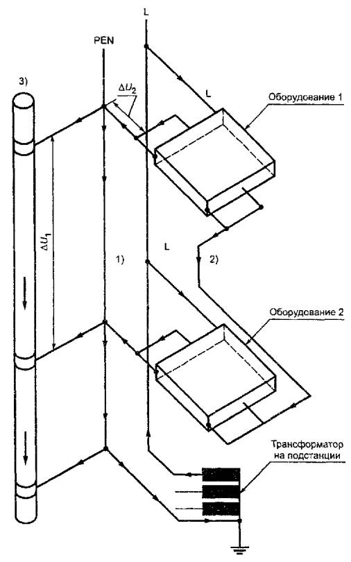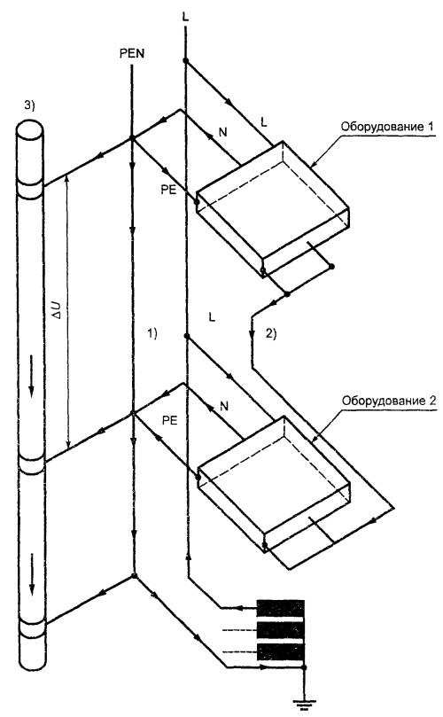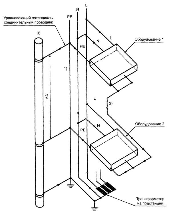 1) - устранение падения напряжения ΔU вдоль РЕ; 2) - соединительный проводник на ограниченной площади; 3) - металлоконструкция здания, например труба центрального отопления