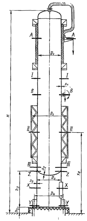 поперечные сечения корпуса колонны, переменные по толщине стенки или диаметру (I-I, II-II, ..., Z-Z по черт. 1); для аппаратов постоянного сечения (по диаметру и толщине стенки) - только поперечное сечение в месте присоединения опорной обечайки;