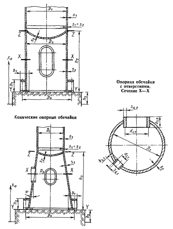 D3 - внутренний диаметр опорной обечайки (черт. 1 и 2) мм (см); у конических обечаек D3 - внутренний диаметр в соответствующем исследуемом расчетном сечении;