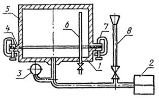1 - стенд для гидроиспытаний; 2 - устройство для создания давления воды (насос); 3 - прибор для измерения давления; 4 - резиновая прокладка; 5 - испытываемая деталь; 6 - трубка для выхода воздуха при заполнении водой; 7 - струбцина для крепления испытываемой детали к стенду; 8 - трубка для предварительного заполнения оболочки водой