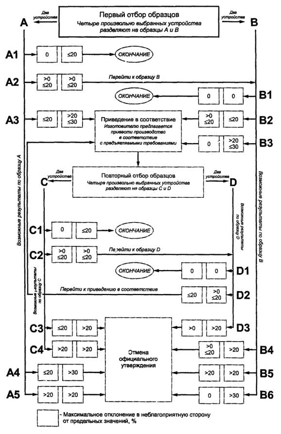 Соответствие не считают доказанным и применяют положения раздела 11 настоящего стандарта, если после отбора образцов согласно рисунку 7.1 отклонения измеренных значений для указателей поворота составляют: