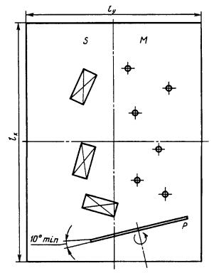 Ни одна из поверхностей источника шума не должна быть ориентирована параллельно ближайшей поверхности реверберационной камеры за исключением случаев, когда такая ориентация обязательна при типовых условиях его работы (см. чертеж).