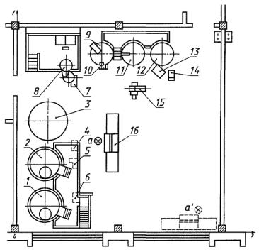 5.2.1 В соответствии с заданными условиями эксплуатации машин в помещении определяют число п одновременно работающих машин и число пp рабочих мест. По схеме расположения оборудования каждой машине присваивают порядковый номер j от 1 до п и каждому рабочему месту - порядковый номер j от 1 до пp.