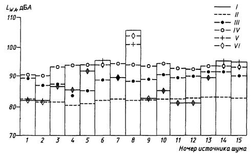 1 - фактические значения; II-IV - предельно допустимые значения, рассчитанные посредством решения системы уравнений (1): для необлицованного помещения (II), с частичной облицовкой стен и потолка и исходным положением рабочего места (III), то же, что III, но с рациональным расположением рабочего места (IV); V - то же, что IV, но с оптимизацией рассчитанных значений звуковой мощности; VI - соответствует максимально возможному значению для источника 8