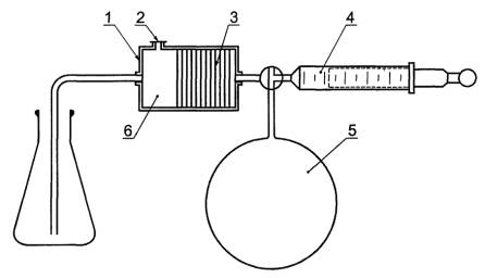 Газообразные пробы вводят с помощью аттестованного стеклянного герметичного шприца (типа Ш-9) вместимостью 200 см3, снабженного трехходовым вентилем и соединительными трубками.
