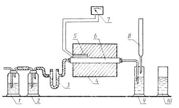 1 - склянка с 30 %-ным раствором щелочи; 2 - склянка с концентрированной серной кислотой (плотностью - 1,84 г/см3); 3 - U-образная трубка с плавленным хлористым кальцием; 4 - трубчатая печь; 5 - термопара; 6 - фарфоровая трубка; 7 - милливольтметр; 8 - бюретка; 9 - поглотительная склянка; 10 - контрольный сосуд